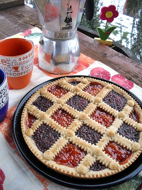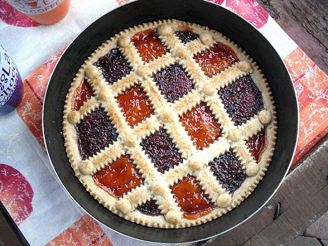 - Ostatak testa tanko razvući i točkićam za picu ili nazubljenom radlom seći trake. Poređati ih dijagonalno preko marmelade (kako izvorno rade u Italiji), ili seći modlicama druge oblike i poređati odozgo. Ivice testa saviti na visinu marmelade, pa testo po želji premazati mlekom.